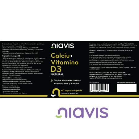 Niavis îți pune la dispoziție o formulă concepută cu grijă, destinată creșterii rezistenței osoase. În compoziția suplimentului se regăsesc calciul și vitamina D3 naturale, cu o absorbție mult mai bună față de variantele de sinteză ale acestor nutrienți. Calciul din acest complex provine din extract de alge marine calcaroase, una dintre cele mai importante surse naturale de calciu, cu o capacitate de absorbție de 96%. În plus, algele marine calcaroase sunt cunoscute și pentru efectul antioxidant puternic.